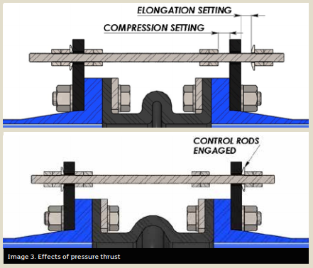 resulting pressure thrust forces would be restrained and eliminate transferring stress to the equipment. Since it is not desirable to have the expansion joint moving in multiple directions at once, locking the joint in its nominal face-to-face length will prevent elongation while still allowing the joint to compensate for any lateral movement (see Image 6).