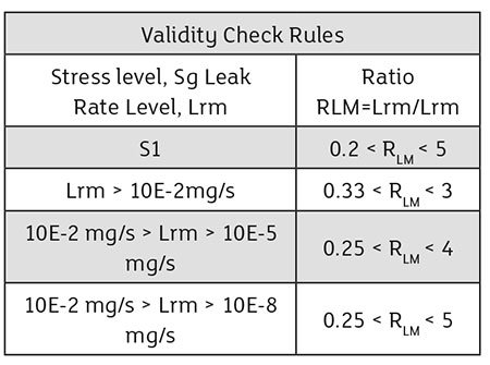 The leakage (expressed in milligrams/second [mg/s] of helium) of corresponding steps in the high-pressure and low-pressure tests are directly compared by dividing the leak rate of the first test of the pair (Lrm1) by the leak rate of the second test of the pair (Lrm2) to produce a ratio: RLM. The data is considered validated if the value of RLM falls within the bands described in Image 4 for each corresponding test step.