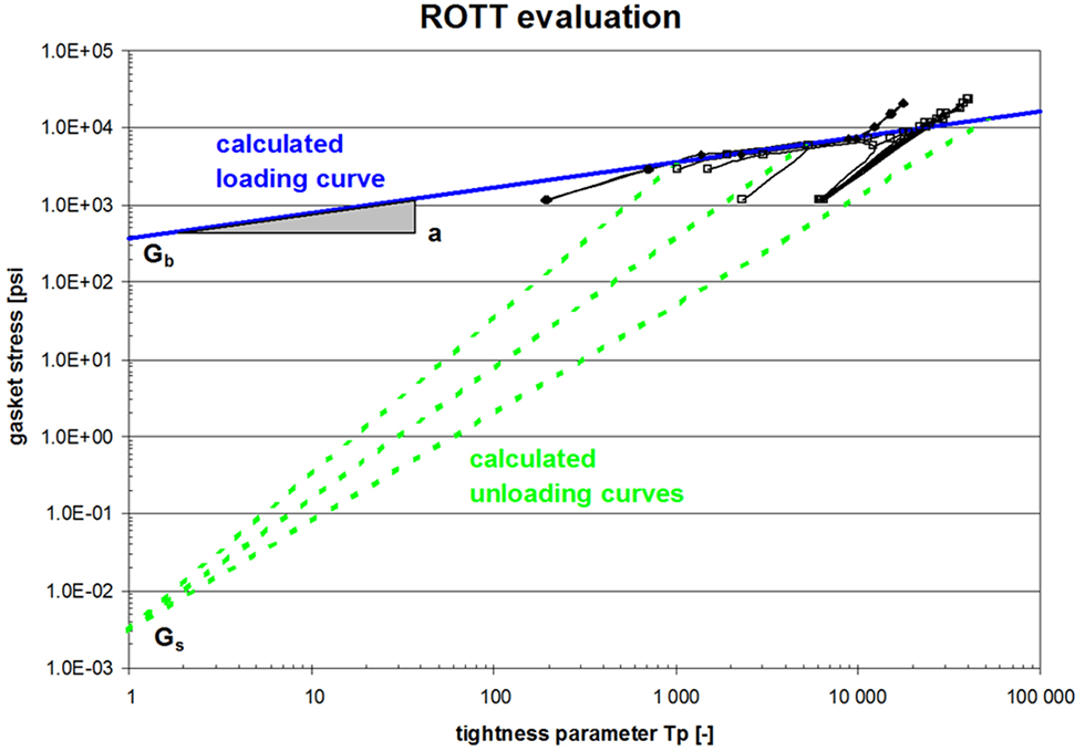 Once acceptable repeatability between the test pairs is realized, the gasket constants a, Gb and Gs may be calculated. The source of these values can be visualized on a combined plot of gasket stress versus the tightness parameter (an expression of leakage, see Equation 1) on log scales for all four tests (Image 5).