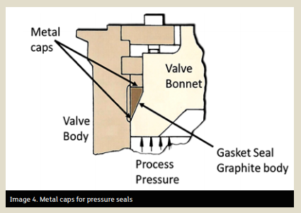 More recently, engineers found a way to use the high axial to radial load transfer of die molded flexible graphite to create a full cavity seal. However, they had to find a way to keep the graphite from extruding under high unit loads. The most common way was to place a thin cap on the top and bottom of the seal. As opposed to a full metal ring sealing only at the toe, and having a potential to damage the valve, the packing-style die molded graphitic seal fully compresses and densifies to fill and seal throughout the entire bonnet cavity. See Image 4.