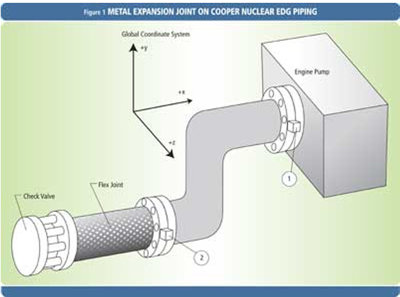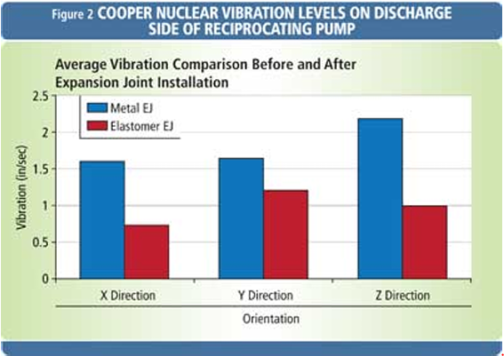 Both of these failures were attributed to high-cycle fatigue of the metal due to vibration from a reciprocating pump. A single metal expansion joint had been installed on both units to accommodate the constant vibration of the pump on the discharge side (Figure 1). After the second piping failure, Cooper Nuclear determined the pump vibration could be mitigated rather than transmitted by using elastomer instead of metal expansion joints.