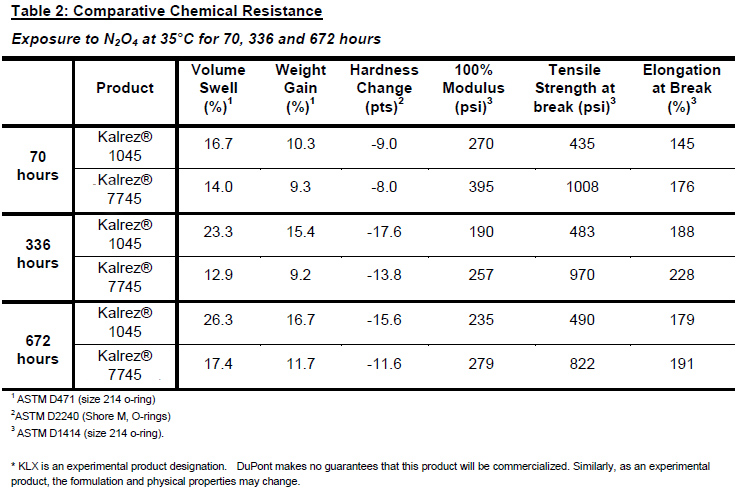 Table 2 compares these two products in nitrogen tetroxide immersion testing. The table shows comparison data after exposure periods of 70, 336 and 672 hours. DuPont™ Kalrez® 7745 exhibits lower volume swell, lower weight gain, and improved physical properties versus 1045, after long- term exposure to nitrogen tetroxide at 35°C.