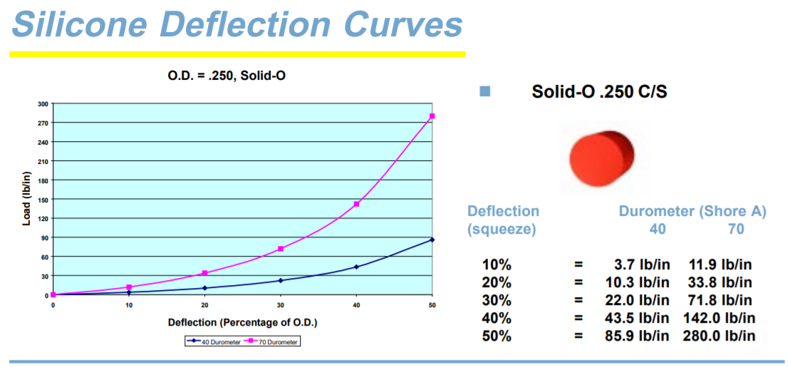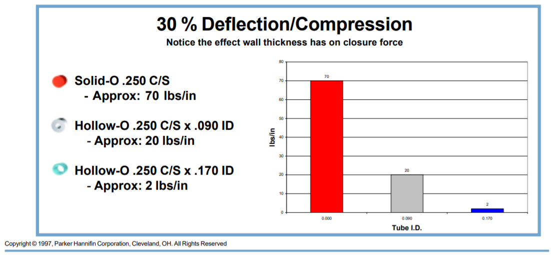 Our partner at Parker has developed a number of proprietary splicing and bonding methods for joining cord stock and extruded profiles into large diameter O-rings and seals. The graphs below show the benefits of using hollow cross-section low-closure-force seals: