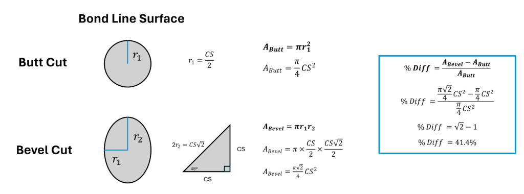 Using the von Mises yield criterion, shear strength can be approximated as 60% of tensile strength. When this relationship is applied to the increased bonding area of a bevel cut, the effective shear capacity of a bevel-cut joint is approximately 13.1% greater than that of a butt cut joint. This increase reflects both the larger bonded interface and the combined contribution of shear and tensile resistance within the angled joint.