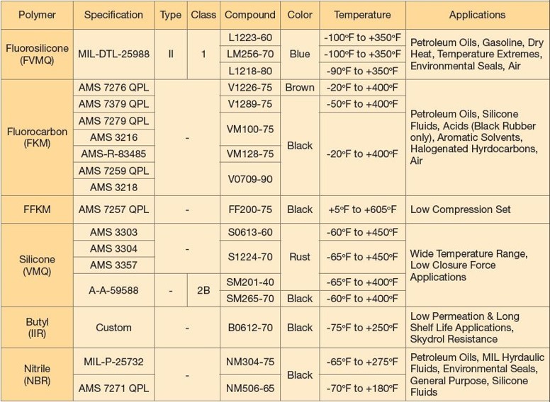 Parker Engineered Seals Division has obtained Qualified Product Listing (QPL) for many standard aerospace compounds in several material families. These compounds can be found in the table below.
