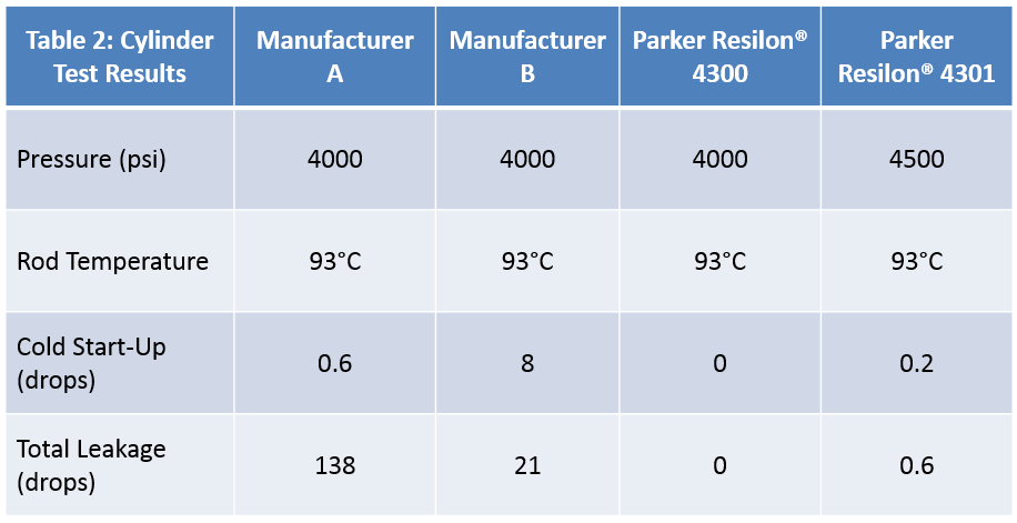 There was zero leakage from Parker’s rod seal package featuring Resilon™4300 polyurethane seals over 309,000 cycles, whereas both Mfg A and Mfg B seals leaked throughout the test.