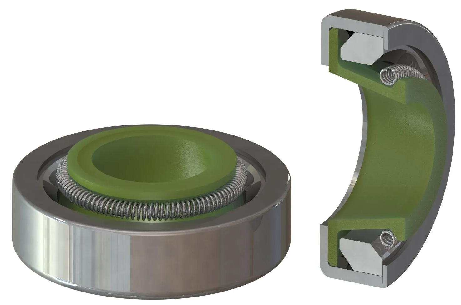 Our partner at Eclipse solved the additional problem of large shaft runouts but incorporating a garter spring on the sealing lip. The machined lip design allows a small ledge for retention. The garter spring provides a constant inward, radial pressure ensuring the lip follows and conforms to the motion of the shaft. Even in high eccentricity and runout situations the lip is always in proper contact with the shaft, all while working within the small footprint of the seal.