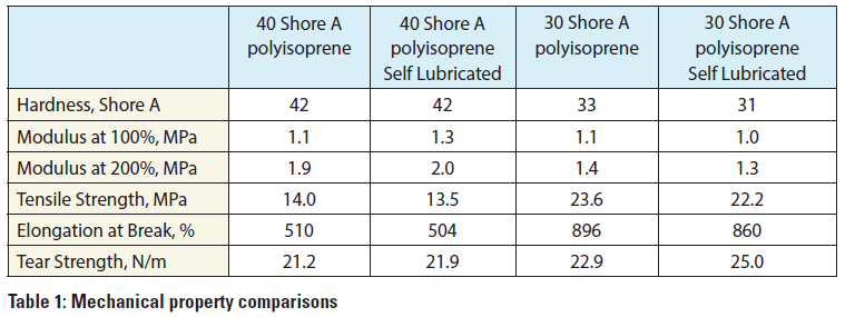 Chemists developed a family of self-lubricated polyisoprene materials that have been manufactured with a proprietary lubricant system and show a minimal reduction of physical and mechanical properties.