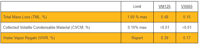 To illustrate, we can look at the most recent outgassing data completed on a few popular low temperature fluorocarbon materials. Table 1 contains the results from a 3rd party laboratory to measure the outgassing properties of VM125-75 and VX065-75. Both had undetectable amounts of CVCM and very small differences between TML and WVR. VX065-75 in particular displayed remarkably little outgassing as well as a low WVR.